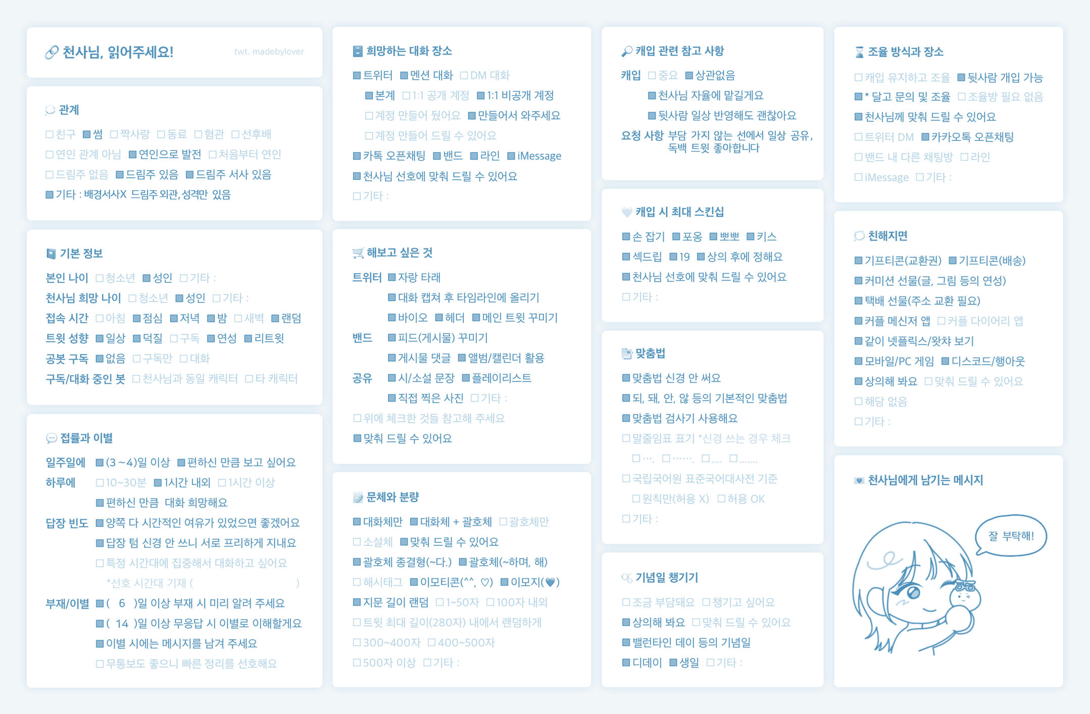 관계가 무르익을 때 쯤 천사님께서 고백하시거나, 제 쪽에서 해도 됩니다.트위터 기능(인용, 바이오, 리트윗)을 적극적으로 써주셨음 합니다.역극 수위와 선물/기념일 챙기는 것은 제 기준 전부 가능하지만 필수가 아닙니다.